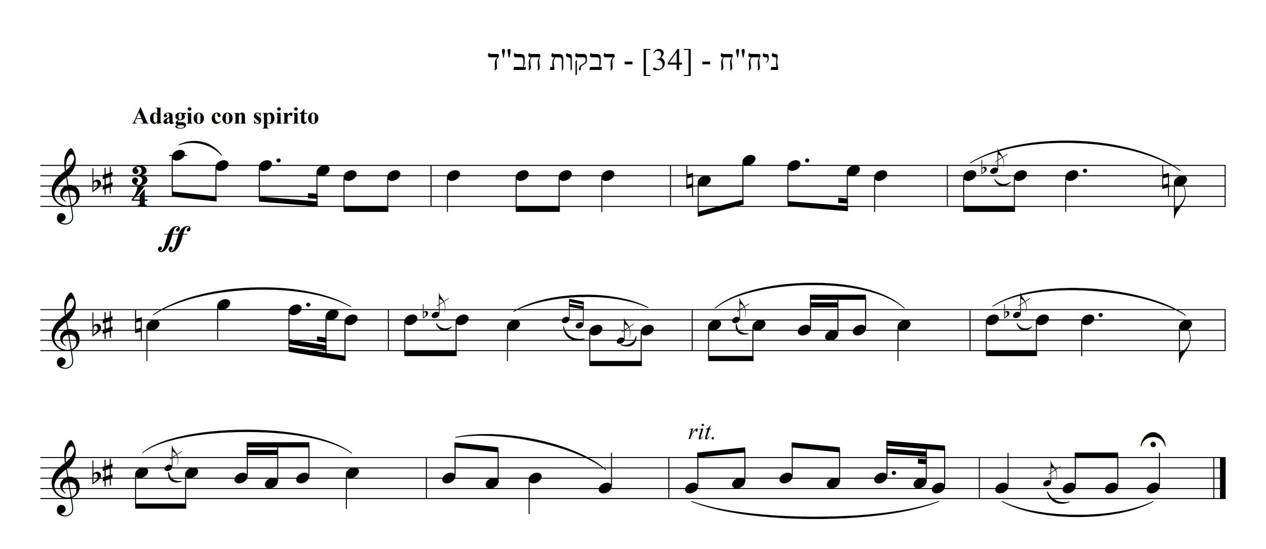 באסופה נרשם: דבקות-חב"ד שהי' מנגנו בעת תפלתו באריכות. מתוך התנועה הראשונה שמתחלת בקול רם מעין צעקת הלב פתאומית, אתה מכיר, שיוצאת מתוך לב רותח, כשהוא מתרגש באמצע התפלה בהתפעלות עזה מהתבוננות עמוקה באלקות, ובתנועות הניגון הבאות אחרי' נרגש תענוג נפשי בכיסופים וגעגועים אלקיים