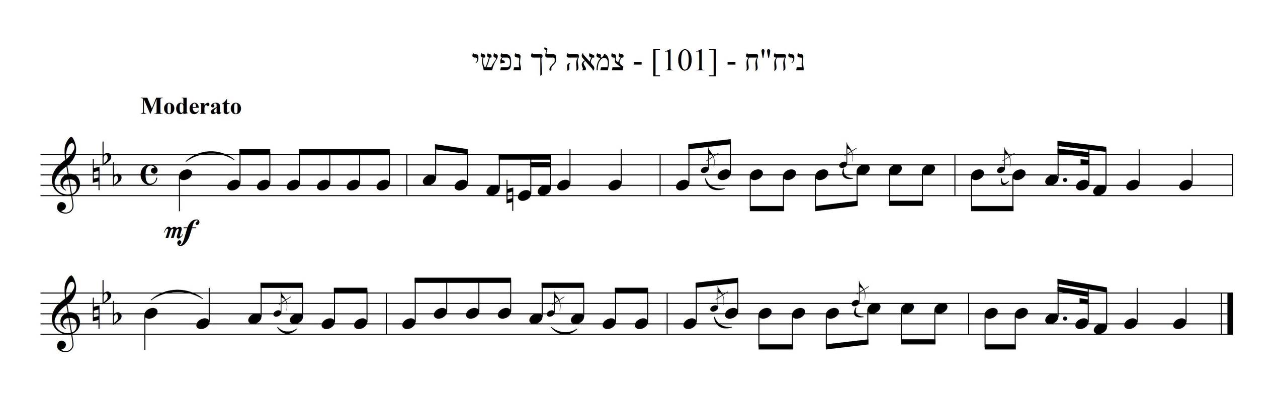 באסופה נרשם: ניגון חבד"י ישן מחסידים הראשונים שבתקופת החב"ד חציו הראשון מושר בתיבות הפסוק צמאה וגו', וחציו השני בתיבות שפת רוסית, אשר תוכנן: תביעה להיצה"ר ונפש הבהמית, ומכנה אותם בשם בם כפר שוטה שנסע ליומא דשוקא - "יאריד" - בהעיר הגדולה, ואינו קונה ואינו מוכר, רק עושה מריבה (בין ישראל להקב"ה). הניגון הזה כולו אומר שירה וגעגועים