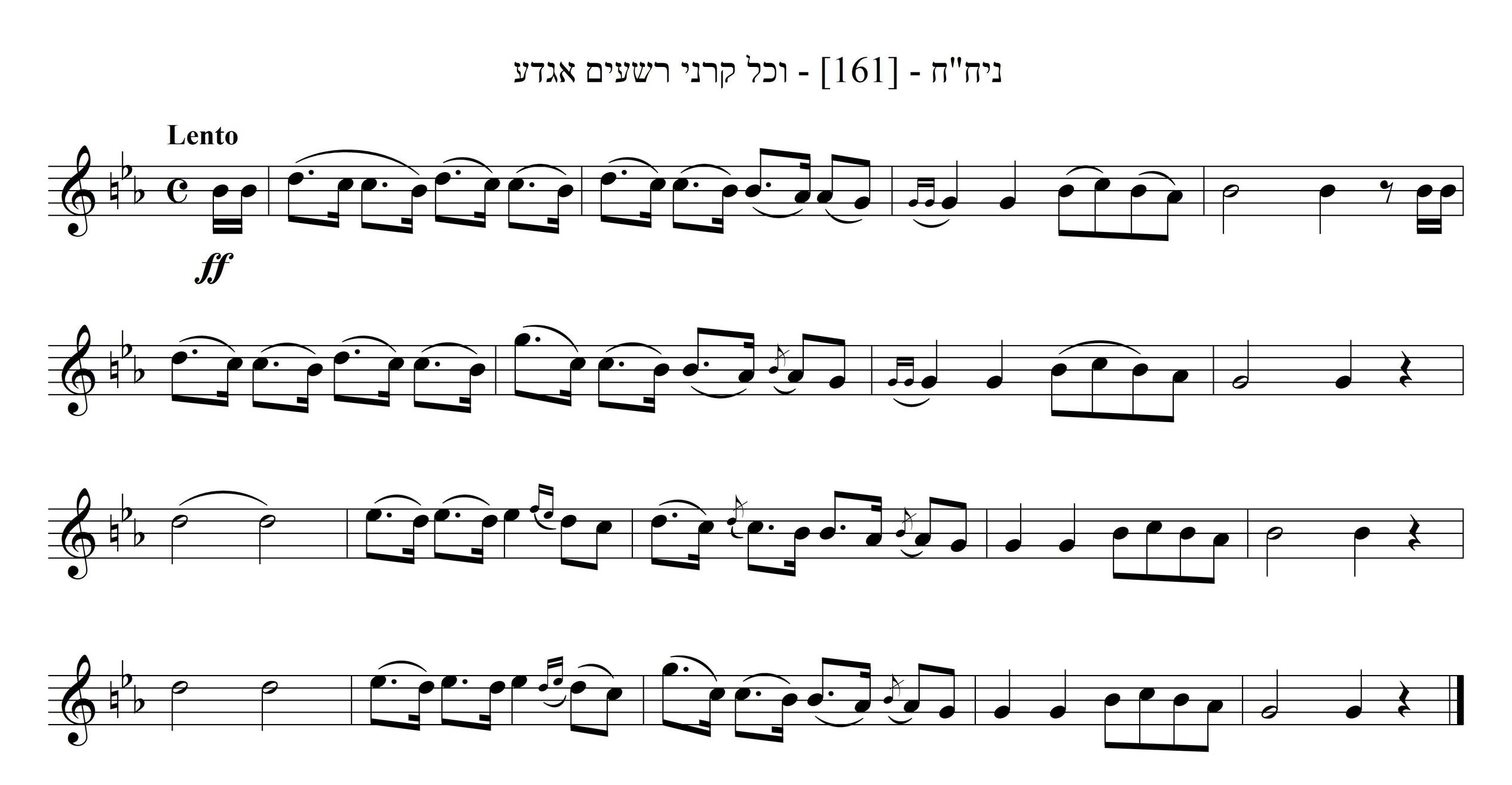 באסופה נכתב: ניגון ריקוד בן שתי בבות, מושר עם הפסוקים וכל קרני רשעים אגדע וגו', תהלים ע"ה י"א, אויביו אליש בשת וגו', תהלים קל"ב י"ח