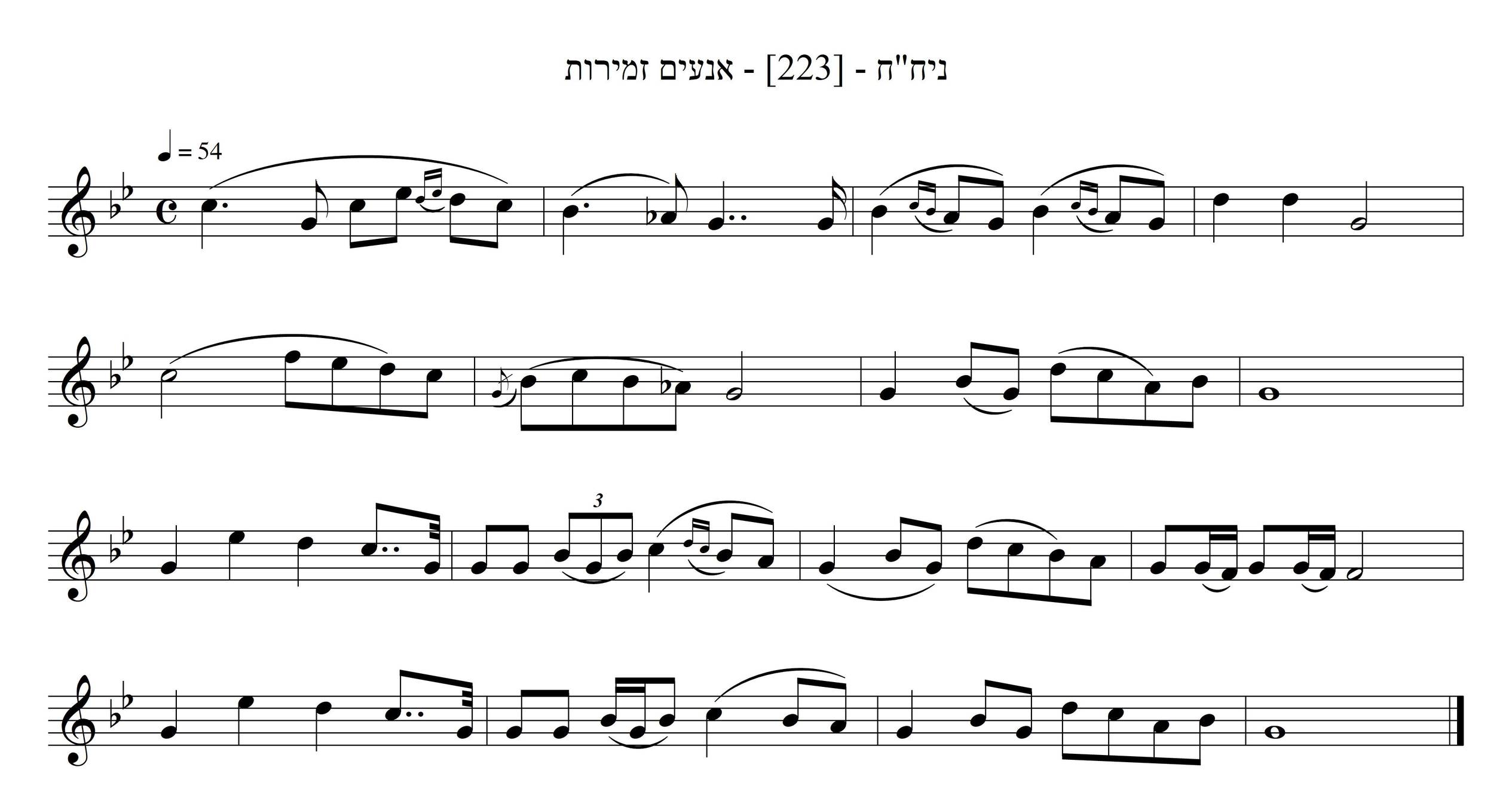 באסופה נכתב: מנגינה מלאה רגשי געגועים המבעת עוסף וגעגועי הנשמה לדבקותה באלקים חיים, המושרת עם המלים של שיר הכבוד (הנאמר בהרבה הקלות אחרי תפלת מוסף בשבת ויו"ט), 'אנעים זמירות'. בליל שמח"ת תשכ"ב לימד כ"ק אדמו"ר שליט"א את הניגון הזה, והסביר את תוכן הניגון [...] ניגון זה הופיע בתקליט ניח"ח מס' 3 צד א' ניגון 1, מפי קבוצת מנגנים מאברכי אנ"ש, ומשם נרשמו התוים לניגון זה כאן