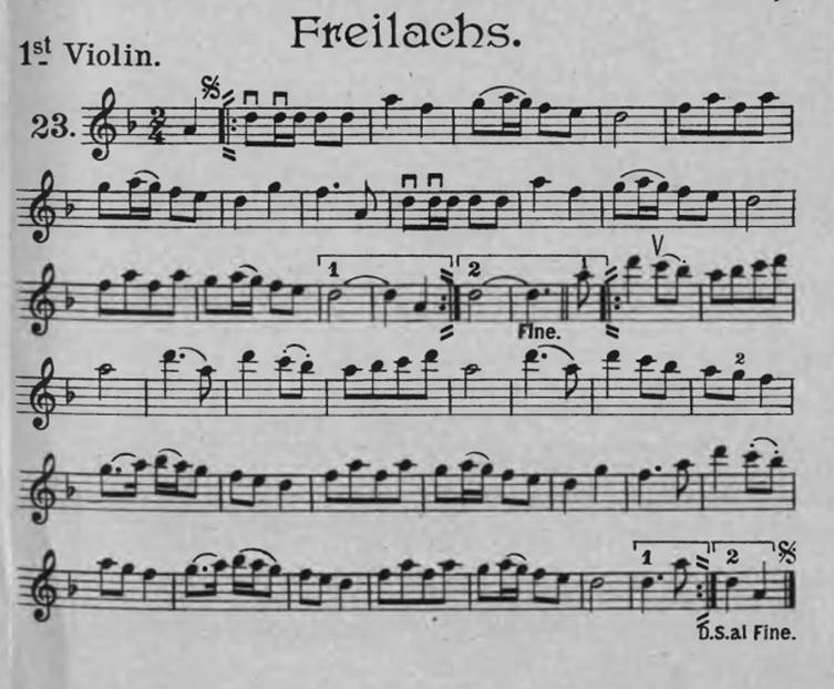 The klezmer version published as "Freilachs" in Kostakowsky, Wolff N. International Hebrew Wedding Music. Brooklyn, N.Y, 1916, no. 23, see the picture belowהערת מומחה: דומה לניגון הורנוסטייפל; ראו הקלטה של ר' נ' טברסקי מתל-אביב, שגדל בהורנוסטייפל, שם נהגו לרקוד לצלילי הניגון במוצאי י"כ