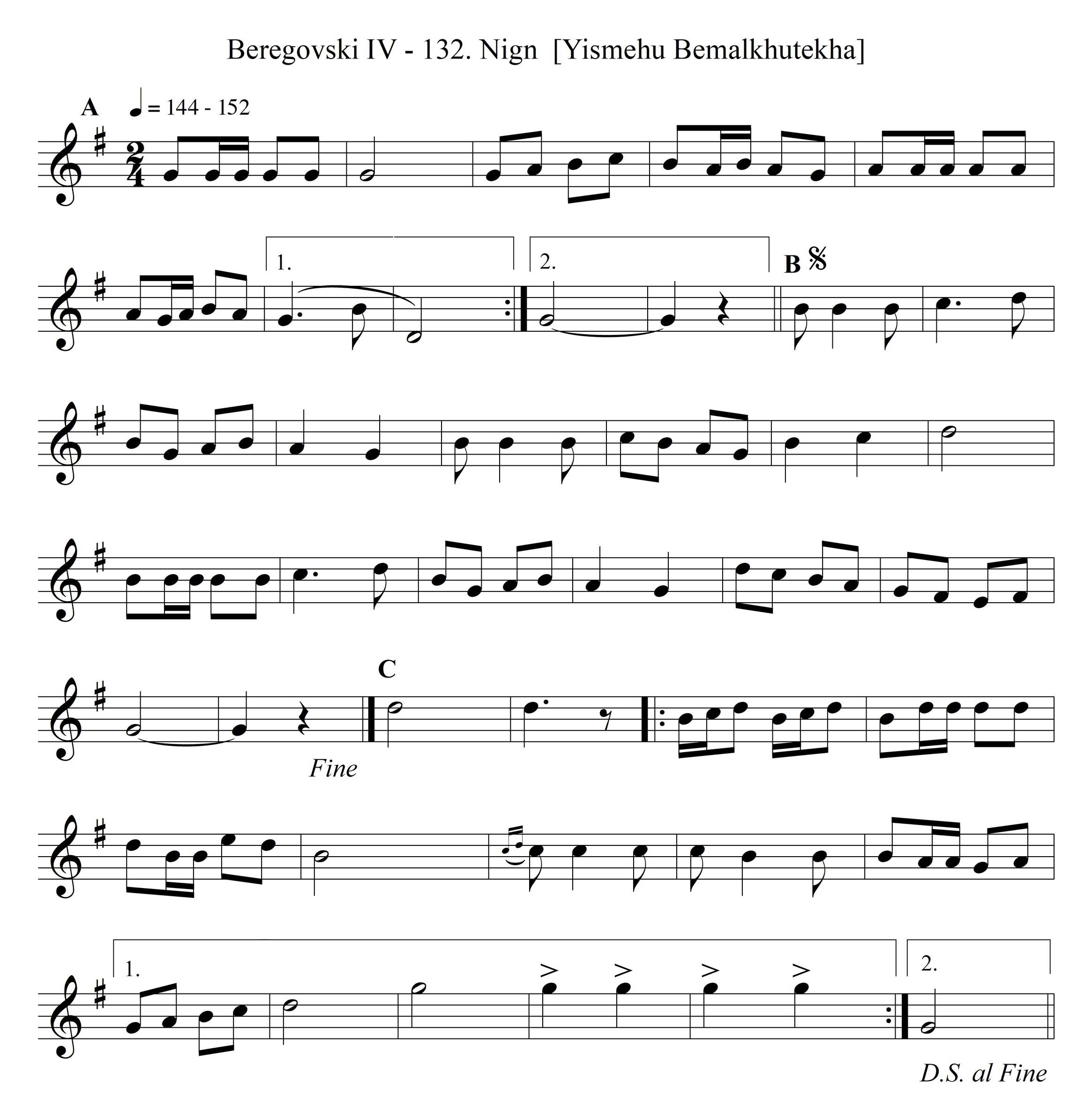 Recorded from B. Robert in the shtetl Slavuta in 1929 (תרפ"ט), Kiev number 118 / 1. Variant: notated from A. Kruglyak (who learned this nign in the shtetl Bohuslav in 1910 - תר"ע), in Kiev in 1920 (תר"ף), Kiev number B-826