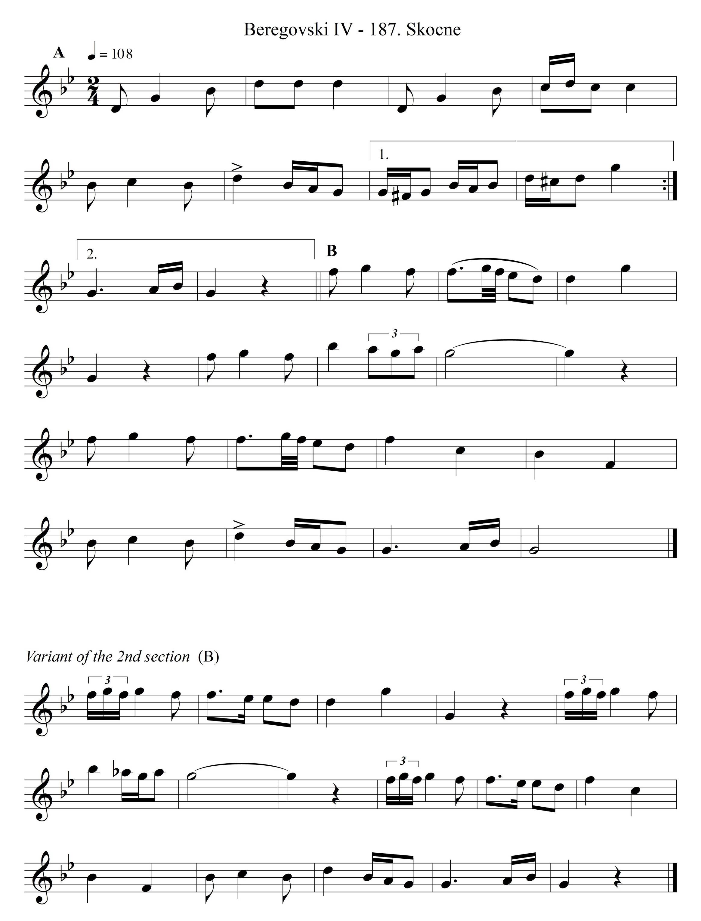 Kiev number A 268 / 1 (K-888): "Performed by Shloyme Kulish, 24, shopkeeper. The performer heard this tune from Avrom Yitskhok Barditshever." Recorded by Z. Kiselgof, 1913 - תרע"ג. One of the performers reported that he learned this tune from a clarinetist who played it as a wedding dance skotshne. For the original recording, see no. 2 under the first URL